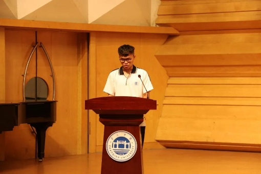 2020级新生袁佑正、蓝嘉宝作为新生代表发言。袁佑正同学表示,他将始终谨记“厚德 明智 博学 力行”的校训,追随无数砚园前辈的足迹,把青春融入祖国山河,做有理想、有本领、有担当的时代新人.蓝嘉宝同学于2018年考上我校车辆工程专业,同时,因响应国家号召,应征入伍,在中国人民解放军火箭军某部队服役两年。今年7月,还英勇参加了江西鄱阳湖抗洪抢险救灾任务。现已光荣退伍复学。他表示将继续保持部队的优良传统作风,始终贯彻“退伍不褪色”,保持一如既往的初心。他最后说到“当兵后悔两年,不当兵后悔一辈子”鼓励大家积极投身军营。