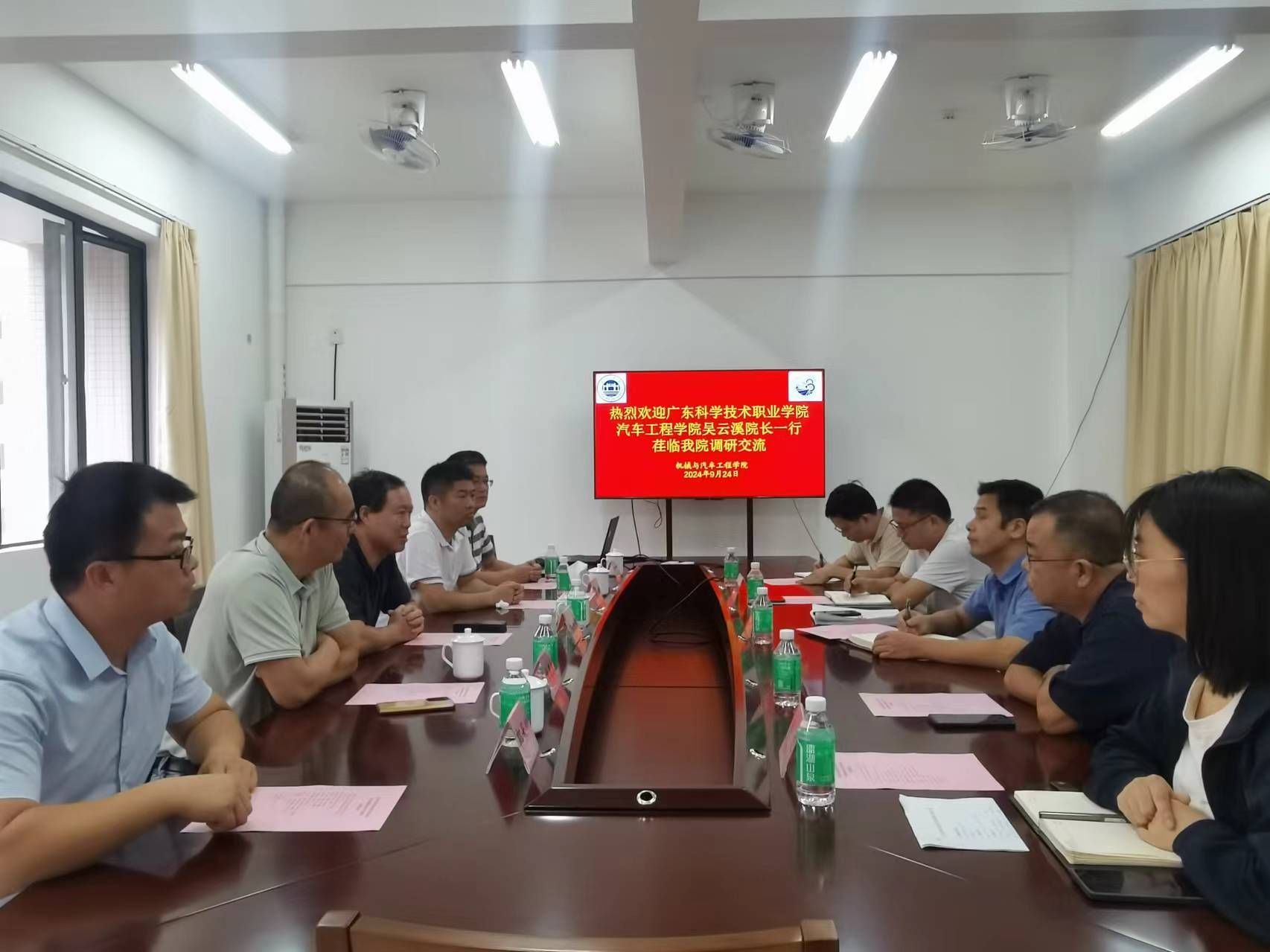 为了提升学院校际合作的广度和深度,9月24日下午,广东科学技术职业学院汽车工程学院吴云溪院长一行莅临我院进行调研交流。我院主持行政全面工作的副院长李剑英、车辆系主任王海、车辆系教师党支部书记、副主任蔡超明以及实验中心主任吴智锋和刘旭博士参加交流座谈。会议由李剑英主持。
