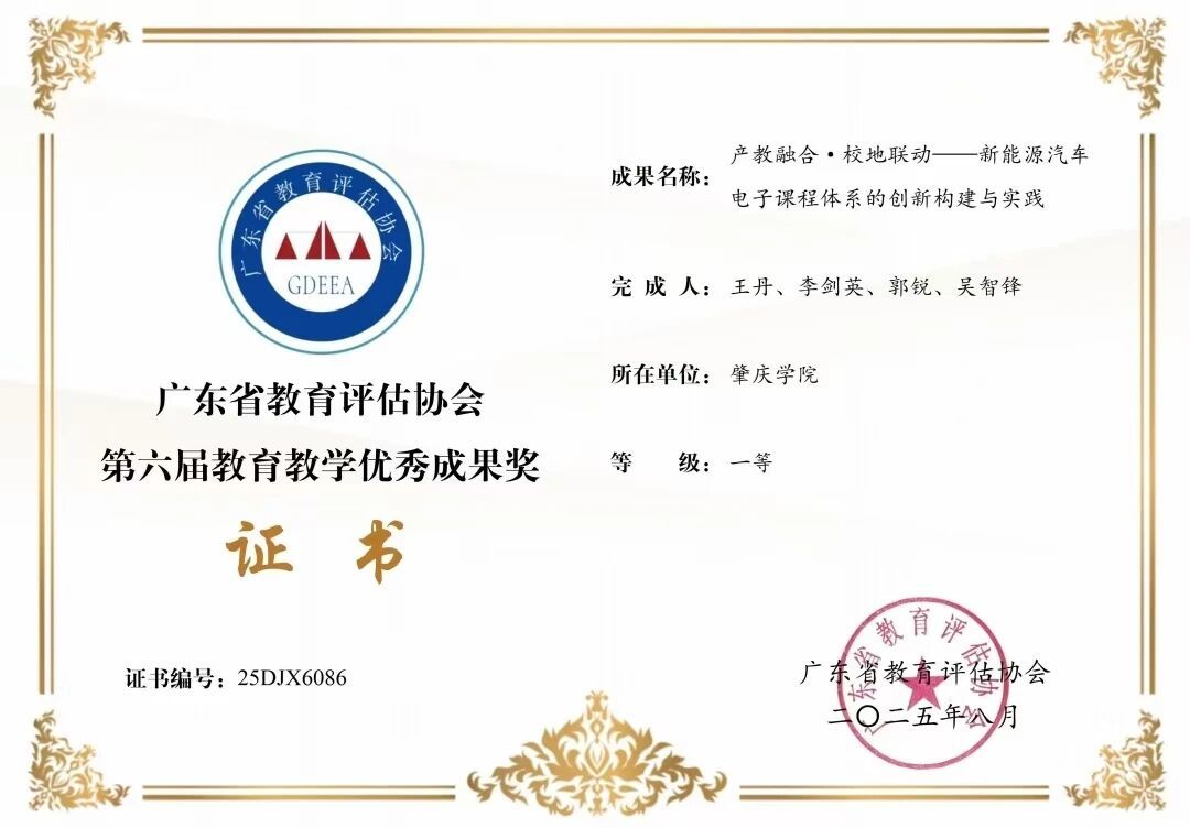 近日,广东省教育评估协会公布了第六届教育教学优秀成果奖评选结果,我院申报的《产教融合·校地联动——新能源汽车电子课程体系的创新构建与实践》项目,从众多参赛成果中脱颖而出,荣获一等奖!