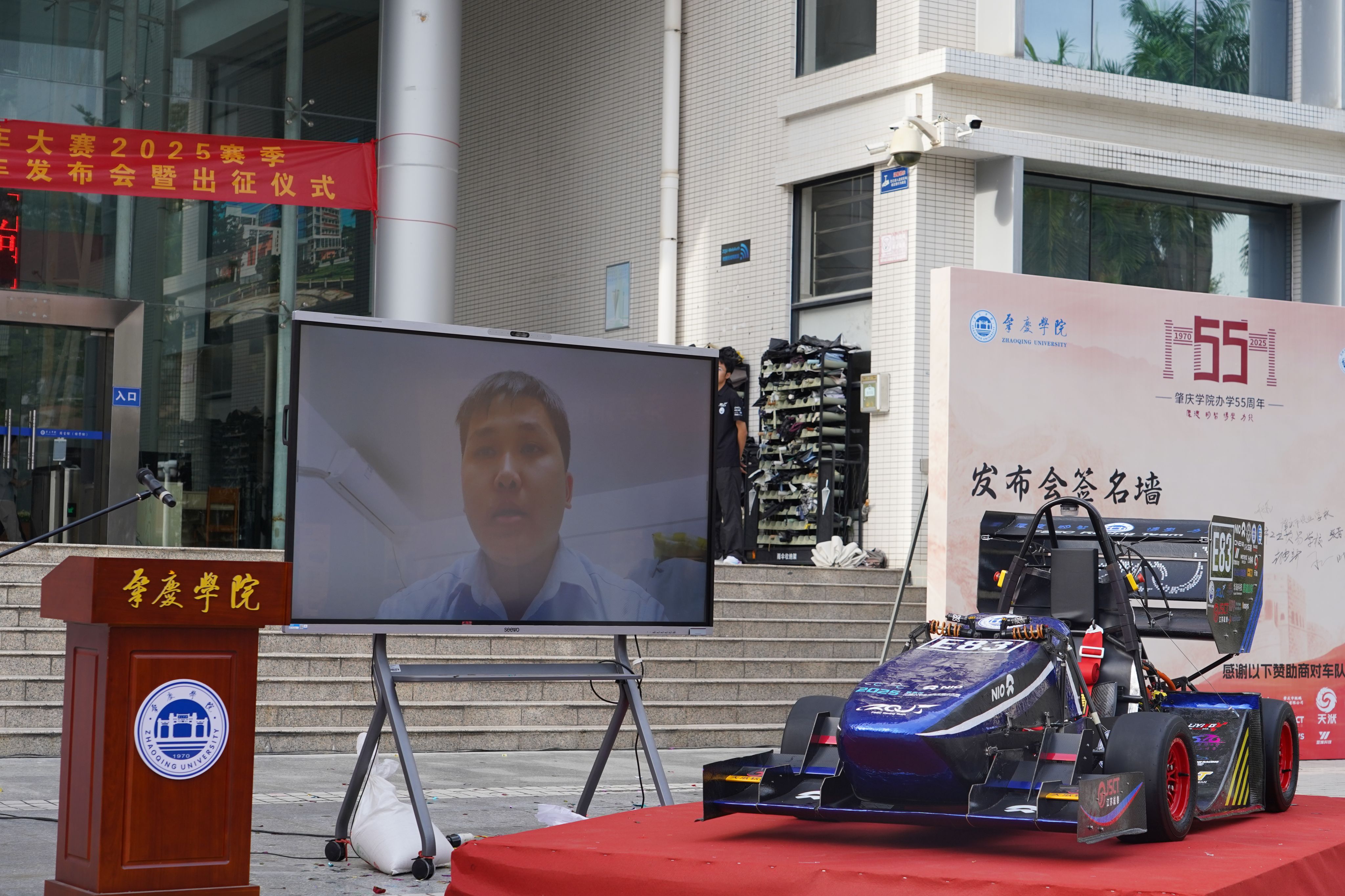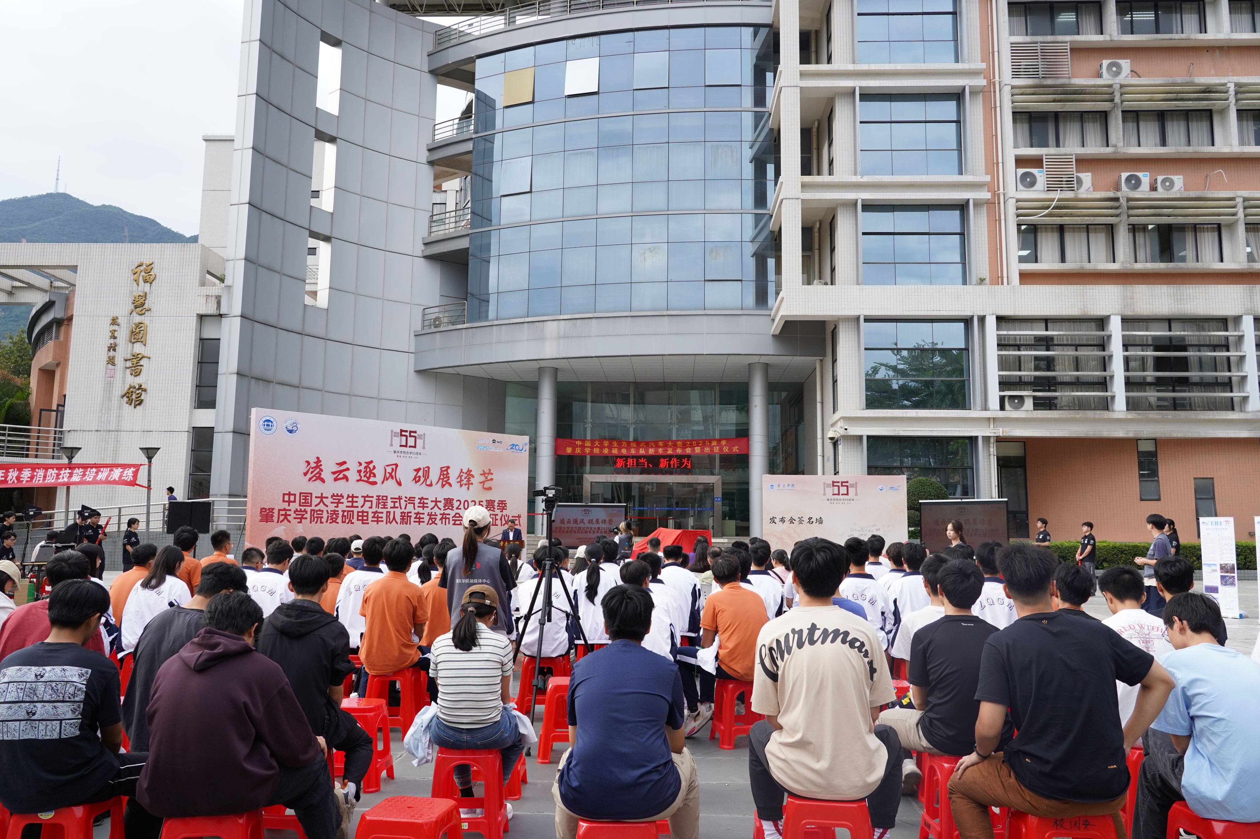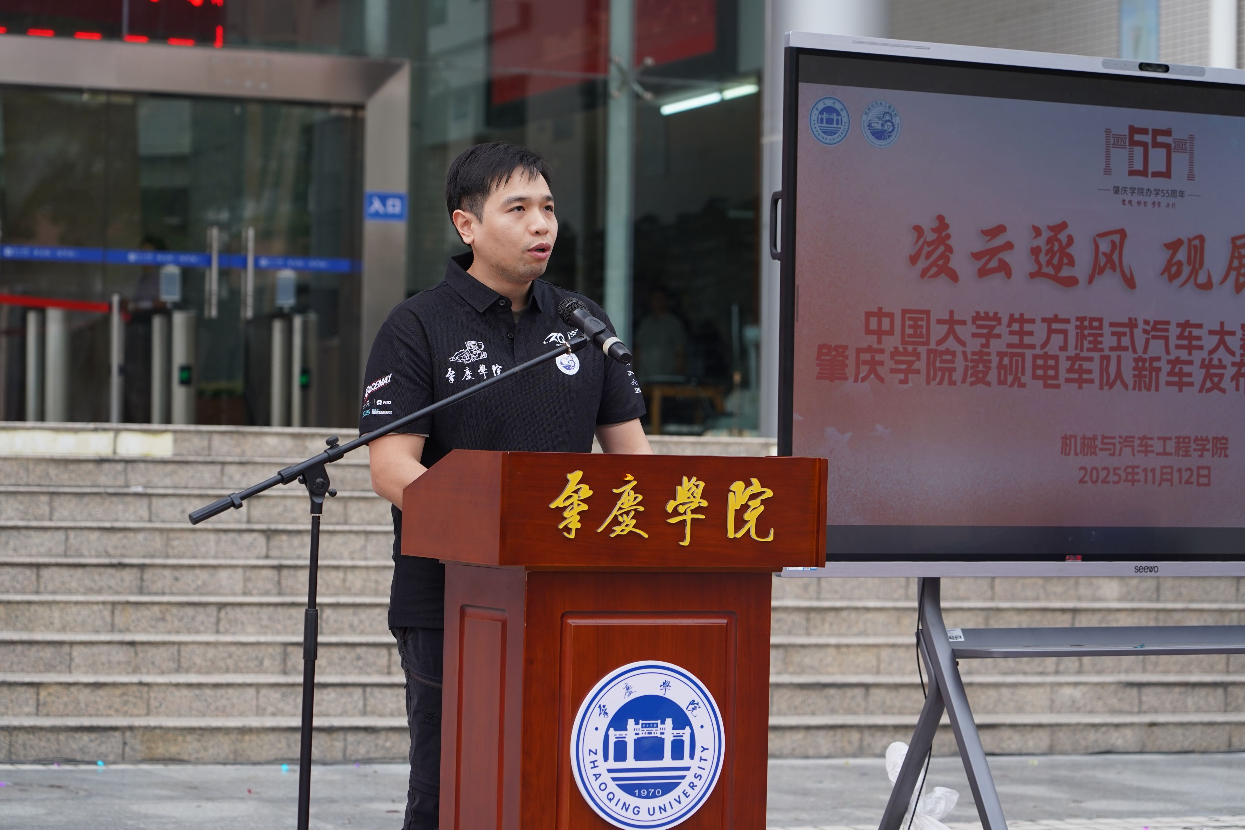11月12日下午,william威廉中文官网承办的学校办学55周年高质量发展大会活动之一的中国大学生方程式汽车大赛2025赛季肇庆学院凌砚电车队新车发布会暨出征仪式在肇庆学院图书馆门前广场举行。本次新车发布会主题是:“凌云逐风,砚展锋芒”,承载着肇庆学院凌砚电车队的奋斗与期盼,也凝聚着学校、企业和全体队员的心血与汗水。肇庆学院凌砚电车队队员们经过无数个日夜的努力,倾注心血的新赛车代号为“凌砚-25”、车号“E83”的方程式赛车,终于整装待发,准备征战赛场!这得益于学校领导和学院老师的大力支持,这也是一段坚守与追梦的故事。