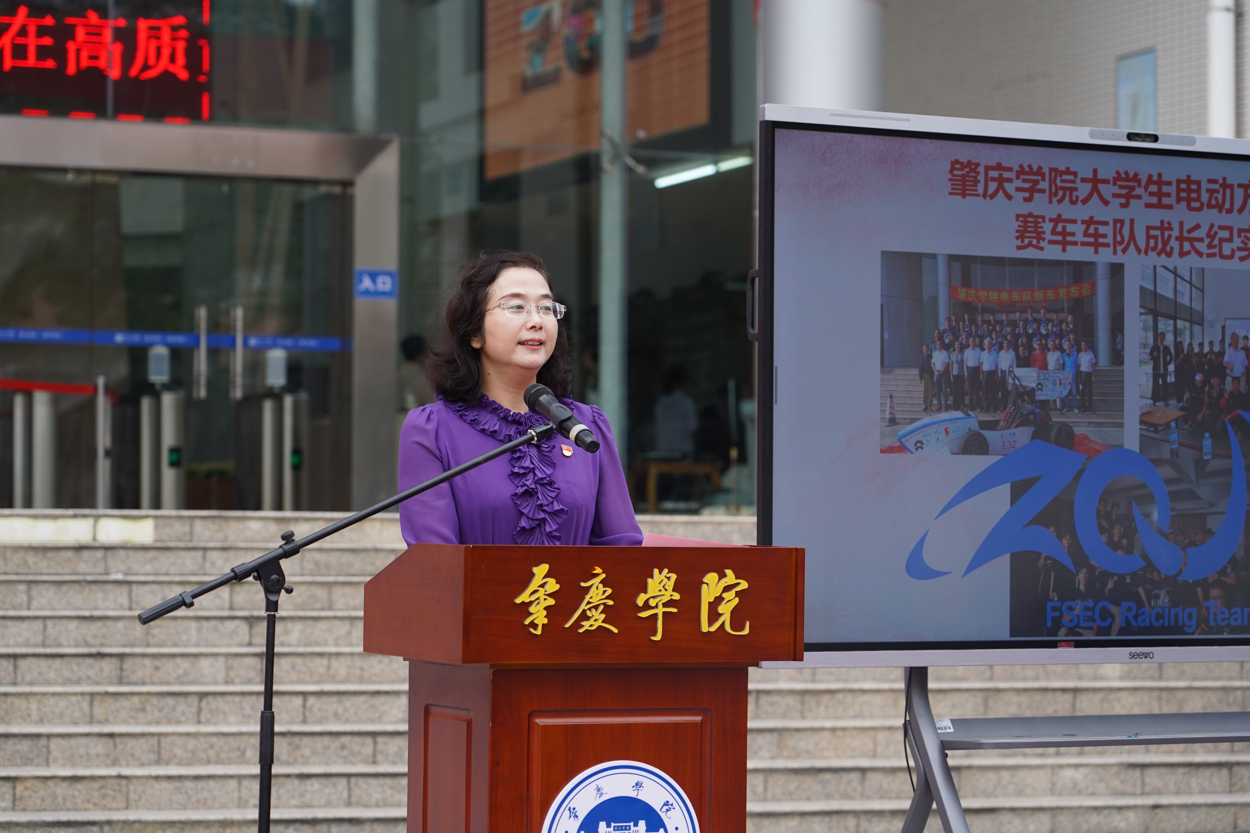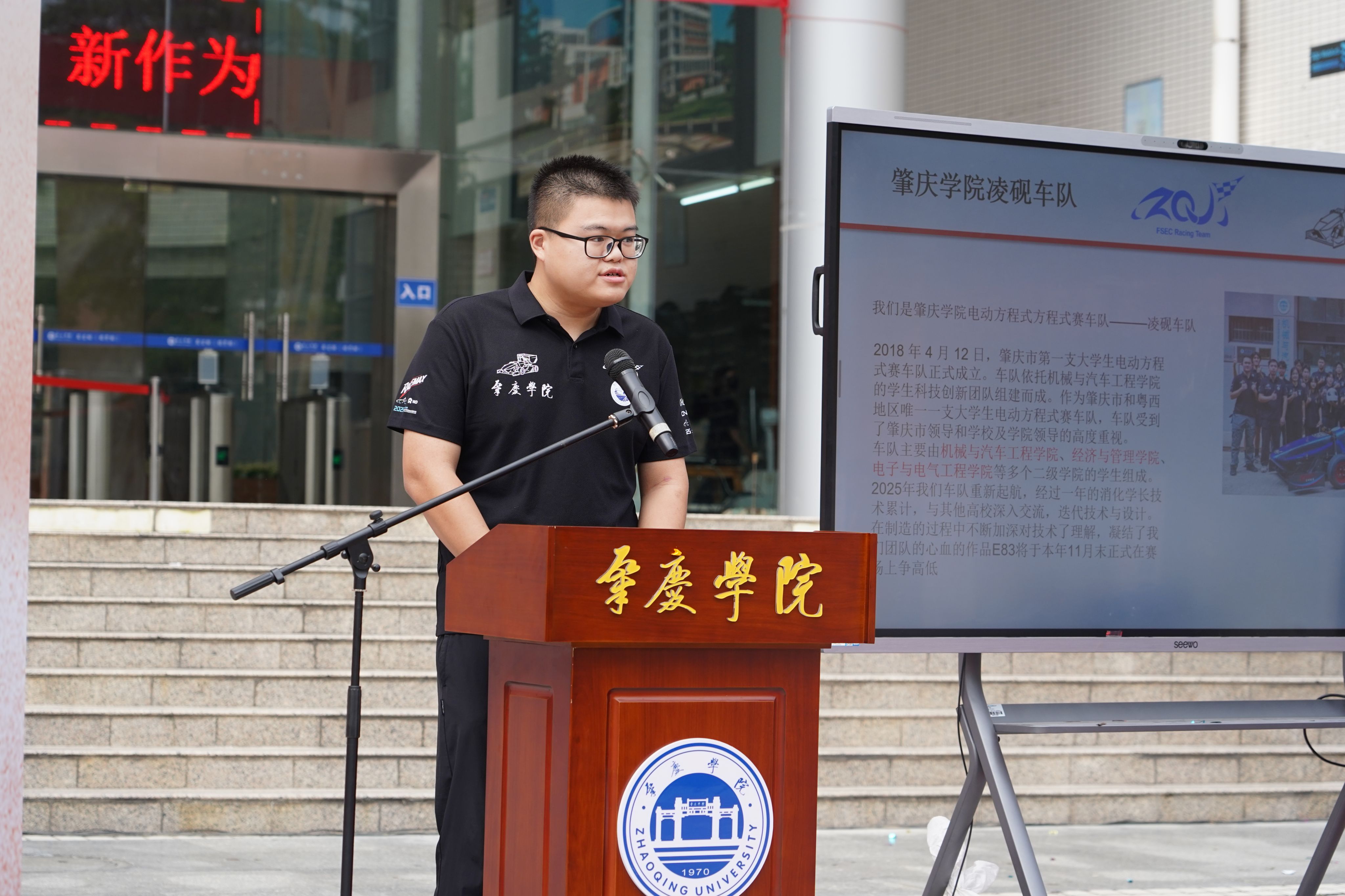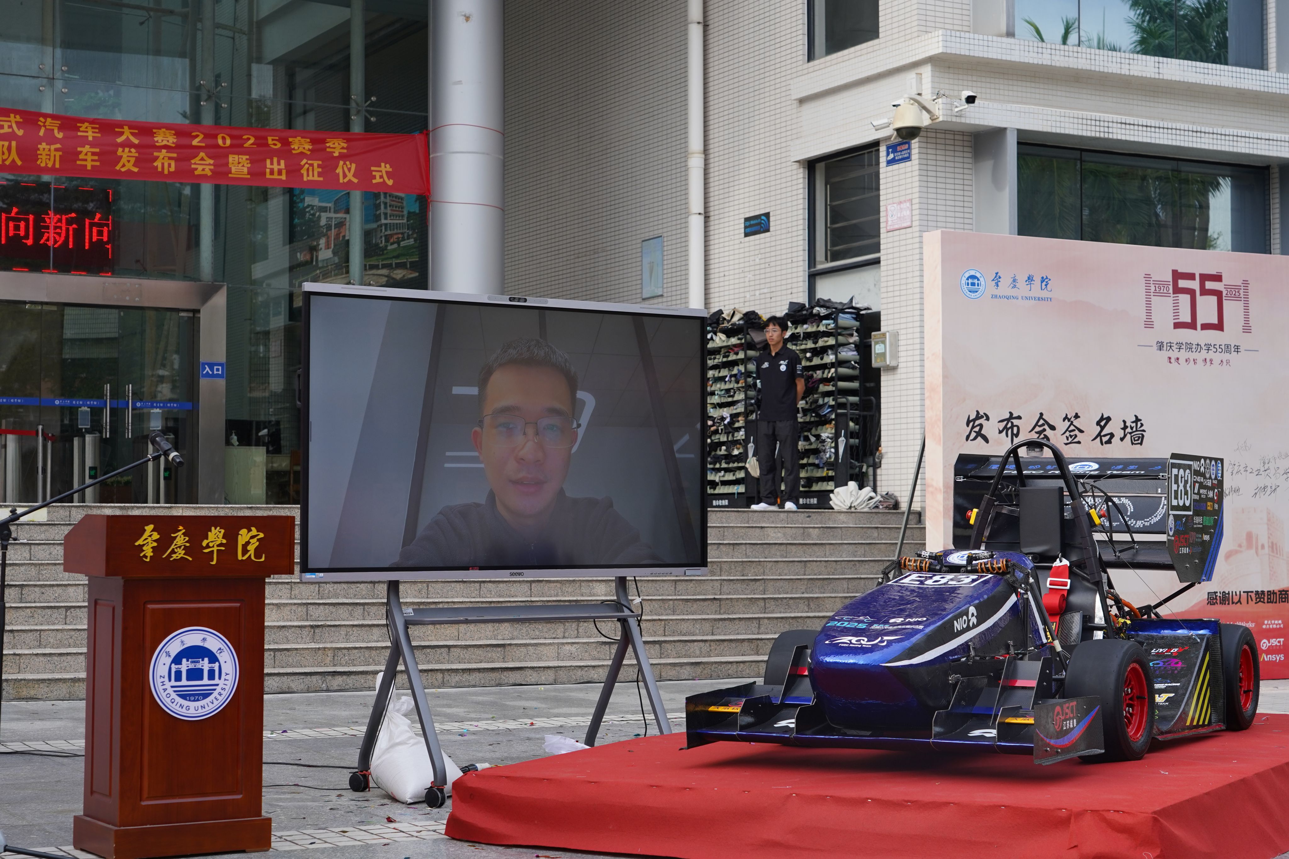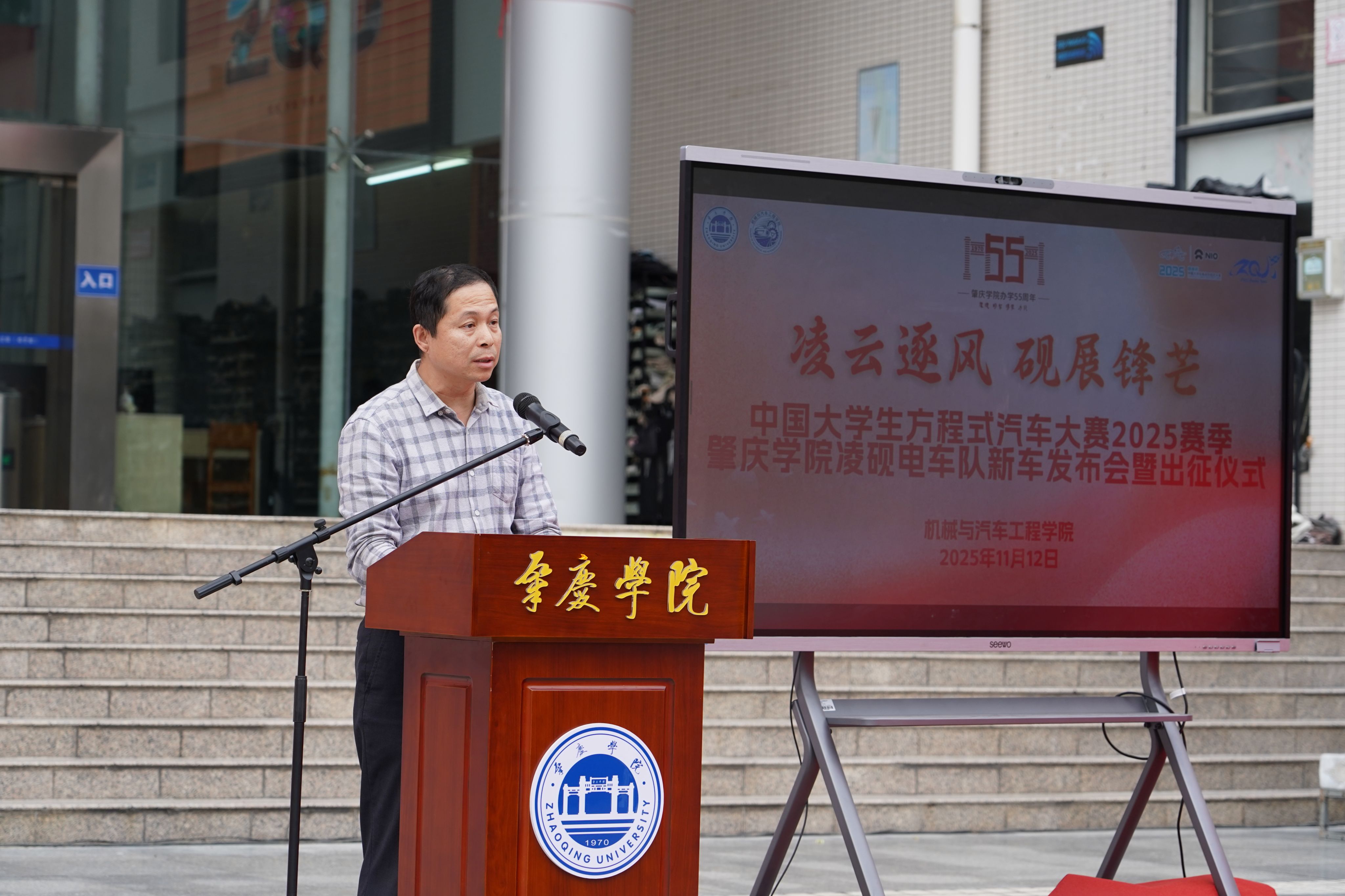 11月12日下午,william威廉中文官网承办的学校办学55周年高质量发展大会活动之一的中国大学生方程式汽车大赛2025赛季肇庆学院凌砚电车队新车发布会暨出征仪式在肇庆学院图书馆门前广场举行。本次新车发布会主题是:“凌云逐风,砚展锋芒”,承载着肇庆学院凌砚电车队的奋斗与期盼,也凝聚着学校、企业和全体队员的心血与汗水。肇庆学院凌砚电车队队员们经过无数个日夜的努力,倾注心血的新赛车代号为“凌砚-25”、车号“E83”的方程式赛车,终于整装待发,准备征战赛场!这得益于学校领导和学院老师的大力支持,这也是一段坚守与追梦的故事。