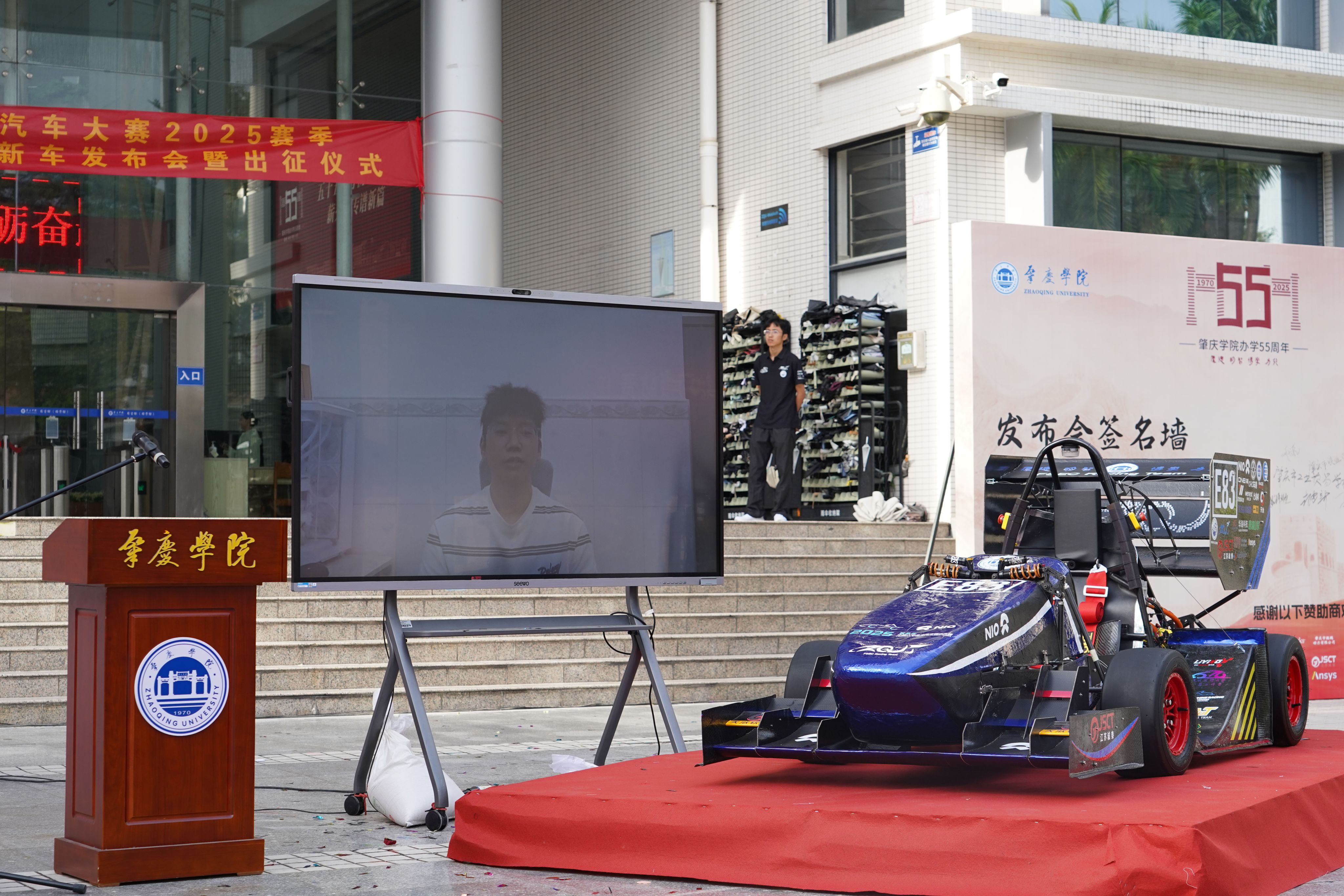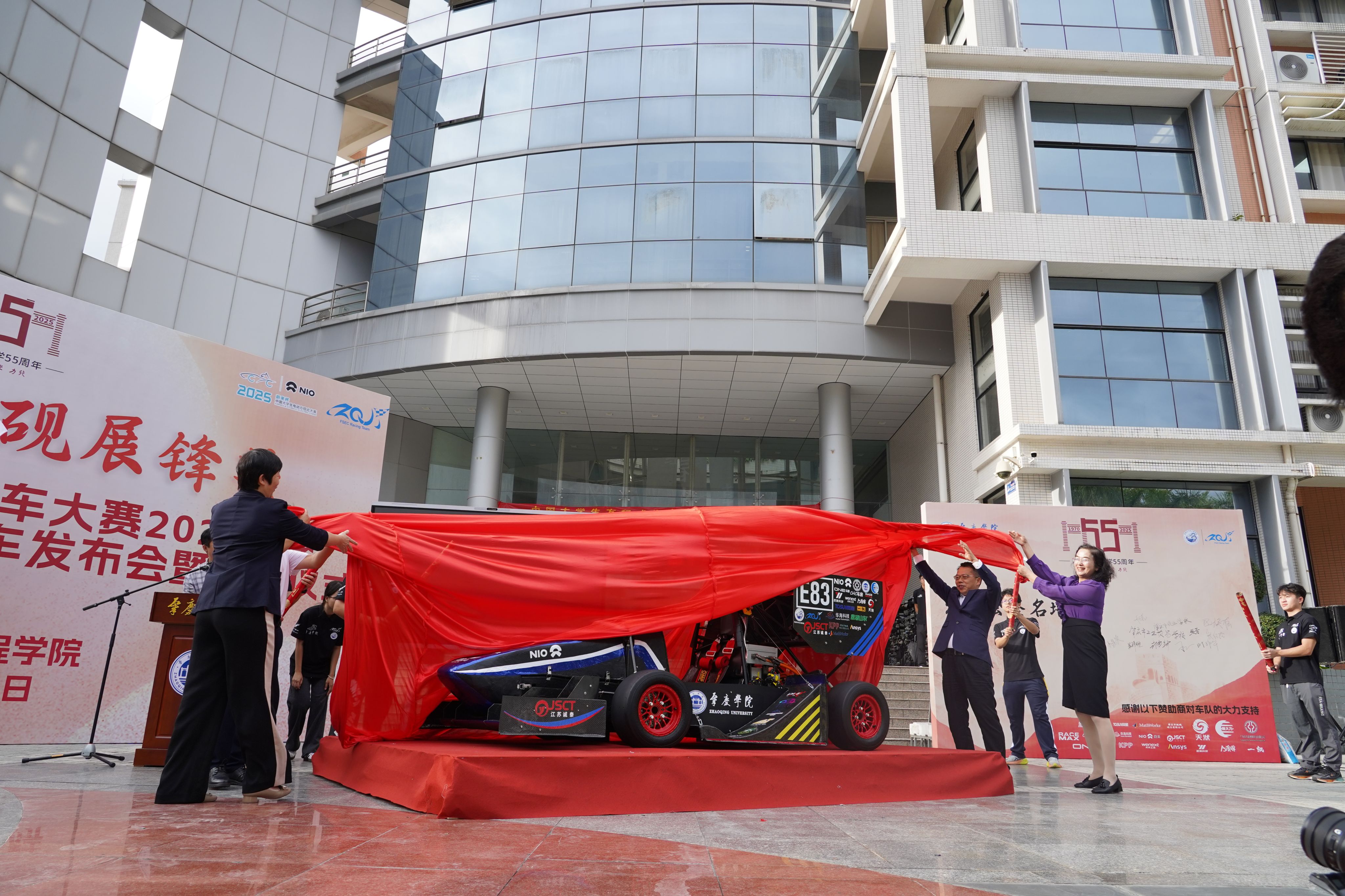 胡文涛副校长、李妍部长、叶非华院长、田华书记一同为即将征战中国大学生方程式汽车大赛2025赛季的肇庆学院凌砚电车队新赛车E83揭幕。伴随着现场整齐划一的倒计时声与礼炮声,E83赛车以酷炫姿态惊艳亮相,现场掌声雷动、欢呼声此起彼伏。