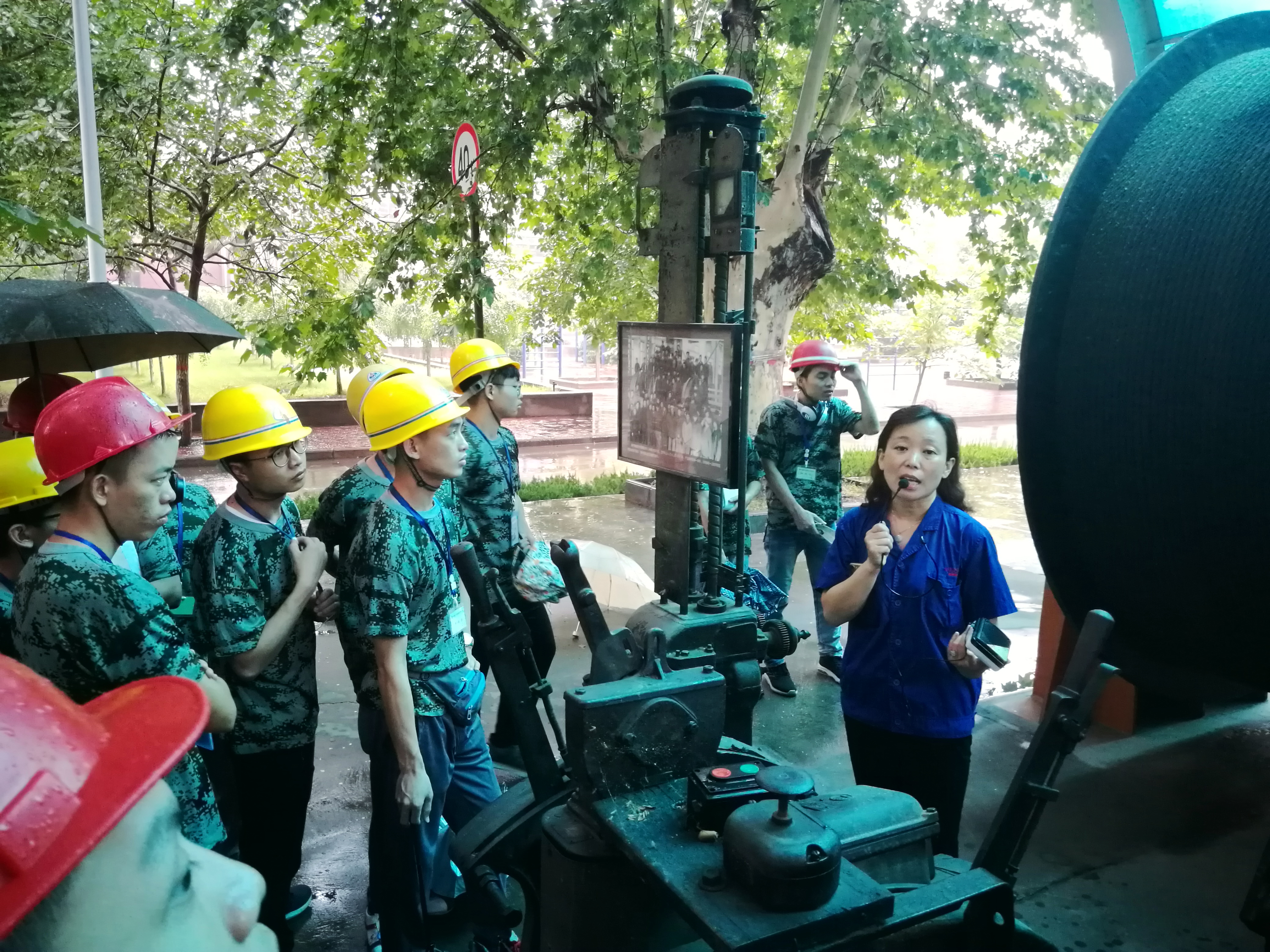 参观完生产车间的大型机械设备后,讲解员带领大家来到位于厂区焦裕禄大道旁永久安置的一台报废矿井提升机前,回顾焦裕禄在洛矿工作的日子。这台矿井提升机是由焦裕禄担任总指挥,在1958年春带领第一代洛矿人克服重重困难奋战3个月后研制出的中国机械工业的代表作:新中国首台直径2.5米的矿井提升机(卷扬机),该提升机的问世填补了中国矿山机械制造的一项空白,充分向众人展示了“没有条件,创造条件也要上”的艰苦奋斗精神。