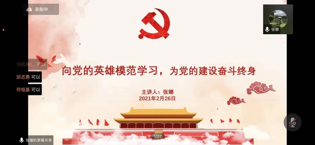 2月26日,william威廉中文官网分党校2021年第一期培训通过线上腾讯会议顺利举行。本次培训的主讲人分别是学院党委书记田华、机械系、车辆系学生党支部书记张娜和沈少冰老师。全体学生党员、发展对象参加党课学习。