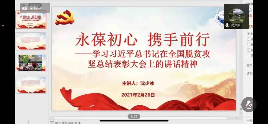 沈少冰老师讲授《永葆初心携手前行》专题党课。党课内容围绕习近平总书记在全国脱贫攻坚总结表彰大会上讲话精神开展学习。沈老师强调,脱贫攻坚的伟大成绩具有重大历史意义,希望同学们学习“不鹜虚声”的实干精神,脚踏实地,拿出“钉钉子”的劲头,扎实做好各项工作;学习“俯首甘为孺子牛”的奋斗精神,把心思和精力聚焦到本学习主业,锐意进取,要将学习感悟转化为干事创业的精神动力,以更好地成绩献礼建党100周年。
