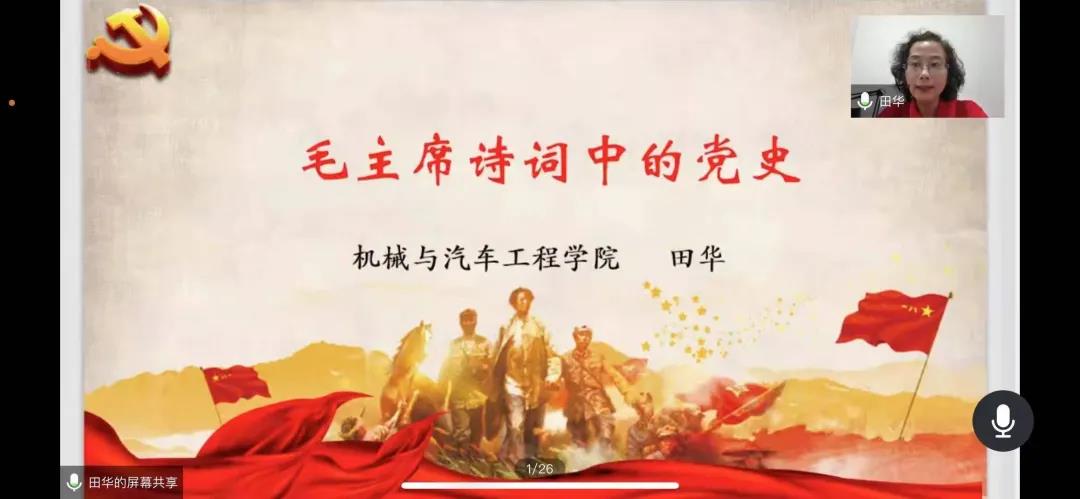 学院党委书记田华讲授《毛主席诗词里的党史》专题党课。授课过程中,田华书记向同学们讲解了毛主席出生时期的时代背景、毛主席诗词里的党史和学习毛主席诗词的感悟。田书记以毛泽东创作的经典诗词为主线,带领大家重读毛主席诗词,理清毛主席领导的中国革命和中国共产党党史中的重大事项,探究中国革命和党史中的红色脉络。同时,结合习近平总书记系列讲话精神,让同学们在欣赏毛主席诗词磅礴气势和博大胸怀的同时,触摸到了党性之根,初心之源,更是以史鉴今,不忘初心,薪火相传。