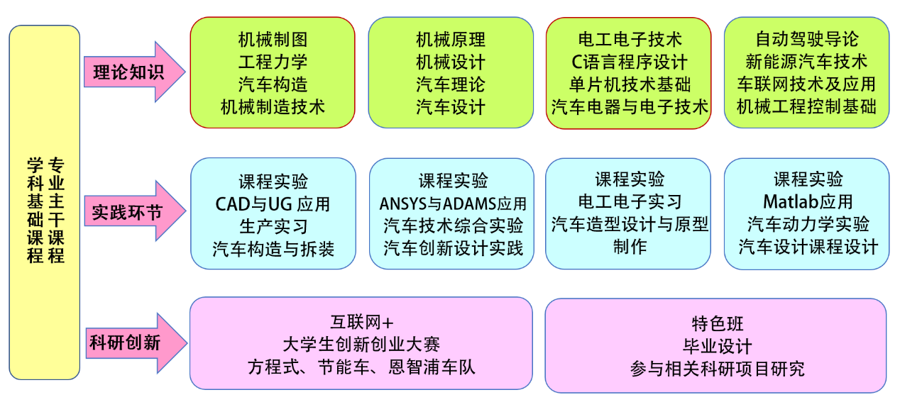 本专业的课程体系规画是参考肇庆地区汽车产业型态和发展趋势,以就业为导向,突出实用性、实践性、先进性和综合性的原则;以新能源汽车及汽车零部件的设计与制造为基础建构相关课程:机械原理、机械设计、汽车构造、汽车理论、汽车设计等相对独立又相互支撑的职业岗位课程群,其中针对新能源汽车的课程设置有新能源汽车技术、驱动电机及应用、动力电池技术、新能源汽车电控技术、汽车电器与电子技术、自动驾驶导论、车联网技术及应用等课程。使毕业生具备专业必须的机械设计制造、电工电子技术、汽车构造原理和新能源汽车领域的知识与技能。